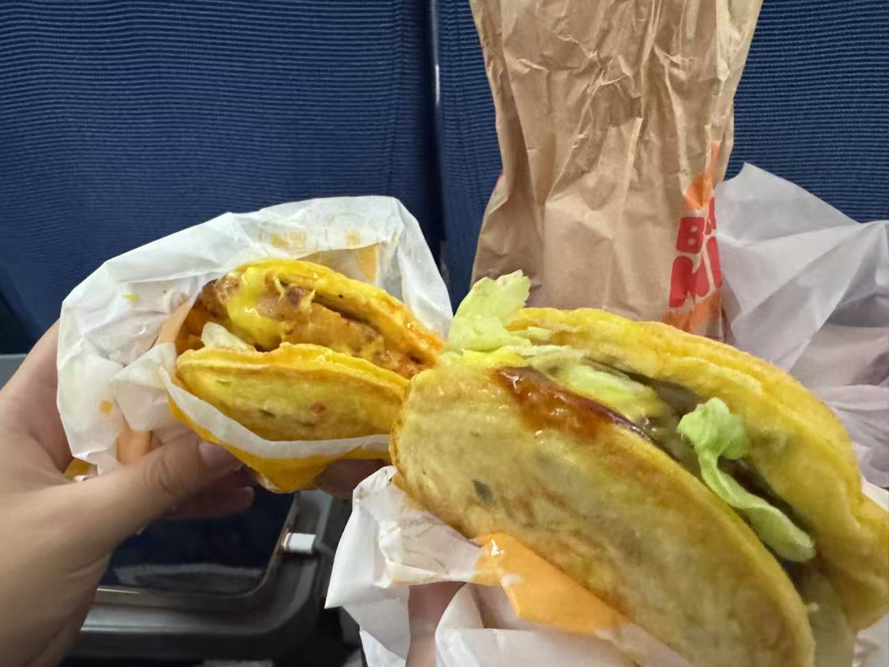 路上宝给我们买了汉堡王的早餐~宝说这个汉堡不好吃,因为没有面包全是鸡蛋🍳