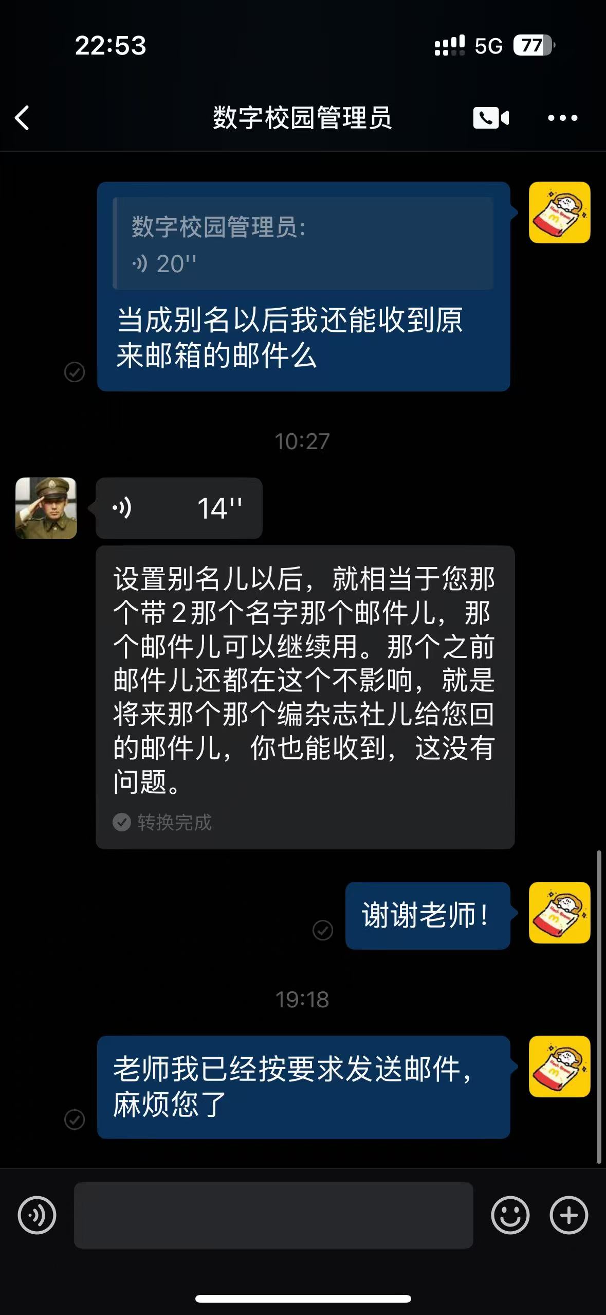 聪明勇敢的小羊通过企业微信联系负责邮箱的老师解决了!没有任何中间人的帮忙!小羊一个人自己花费一天就解决了!